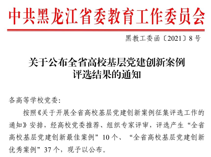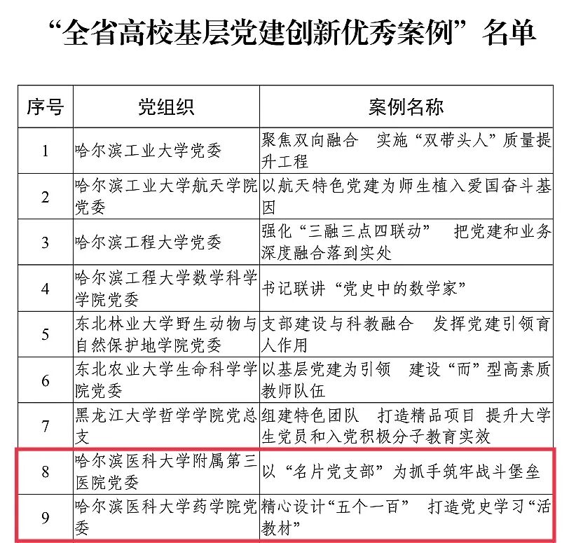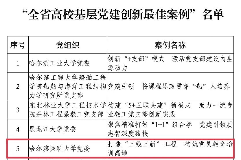 日前,中共黑龙江省委教育工作委员会公布了全省高校基层党建创新案例评选结果,由学校党委报送的《打造“三线三新”工程 构筑党员教育培训高地》荣获“全省高校基层党建创新最佳案例”,附属第三医院党委报送的《以“名片党支部”为抓手筑牢战斗堡垒》和药学院党委报送的《精心设计“五个一百” 打造党史学习“活教材”》荣获“全省高校基层党建创新优秀案例”。