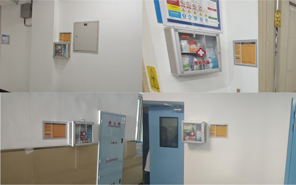 实验室普遍存在高温、低温、高速等各类危险源,实验工作常涉及注射器、枪头、玻璃器皿等,为使意外造成的损伤学校按教研室实际需求配置急救药箱,覆盖创伤消毒、止血包扎等基础应急需求,确保突发伤害第一时间处置,保障创伤处理“触手可及”。