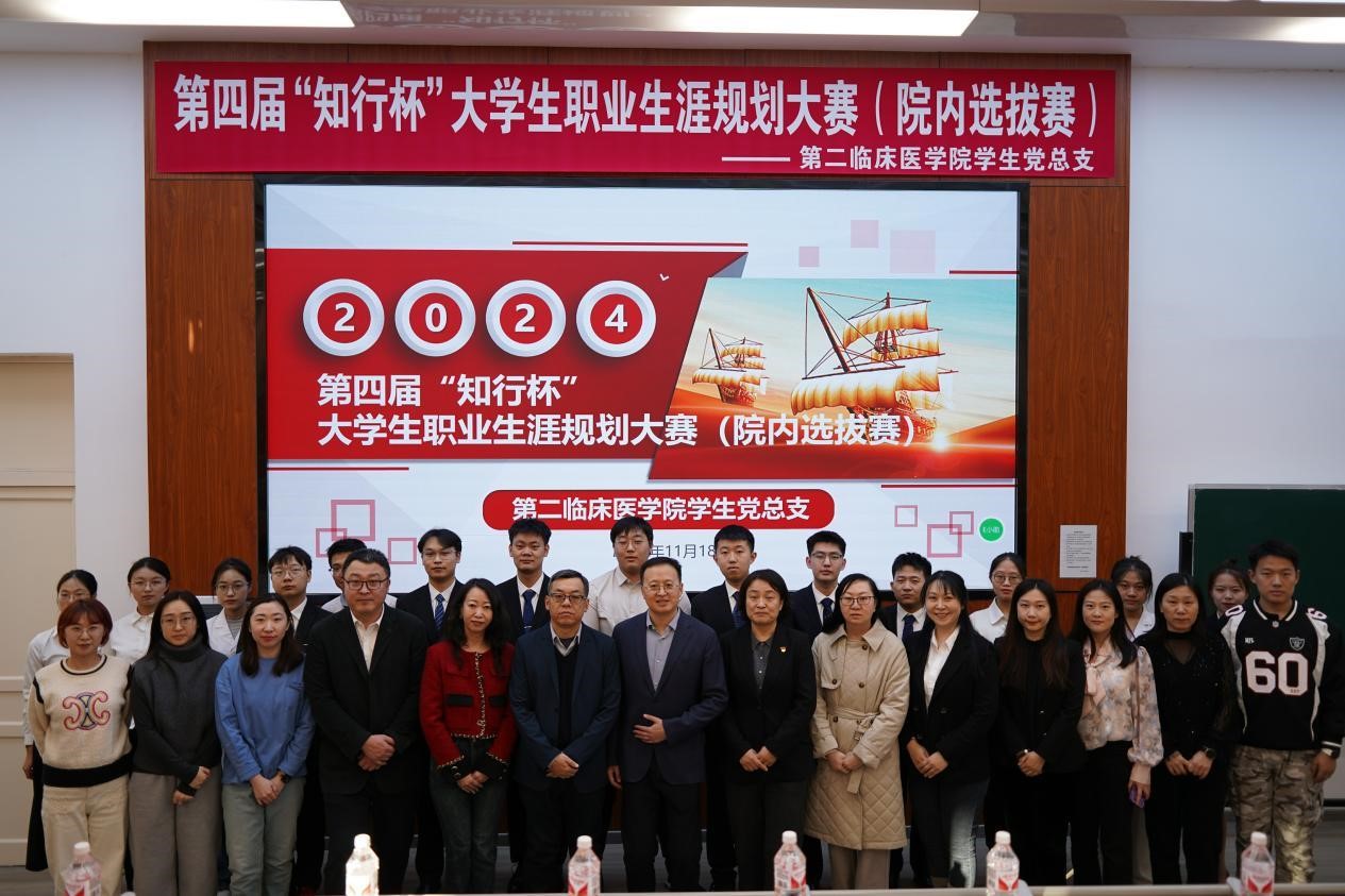 为贯彻落实党中央、国务院关于高校毕业生就业工作的决策部署,按照《教育部关于举办第二届全国大学生职业规划大赛的通知》要求,进一步推动学校生涯教育和就业指导,增强大学生职业规划意识,促进毕业生高质量充分就业,第二临床医学院于11月18日在教学楼2号教室举办第四届"知行杯" 大学生职业规划大赛院内选拔赛。哈医大二院党委副书记王洪亮、哈医大二院副院长吴亚军、哈医大二院学生党总支书记付玉、哈医大二院研究生科科长韩冰、哈医大二院教务科科长张思佳、哈医大二院人事科科长郑旭东、哈医大二院科研科科长杨春燕、哈医大二院团委副书记孙冬莹以及学生科全体辅导员老师担任评委。