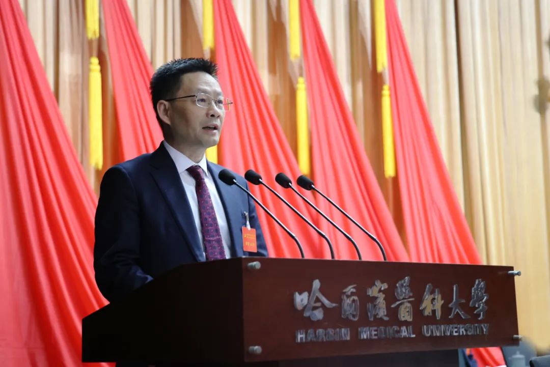 张学代表中国共产党哈尔滨医科大学第二十届委员会向大会作报告。报告共分为四部分:第二十次党代会以来的主要工作;认清面临的形势,明确指导思想和发展目标;未来五年主要任务;以高质量党建引领高质量发展。