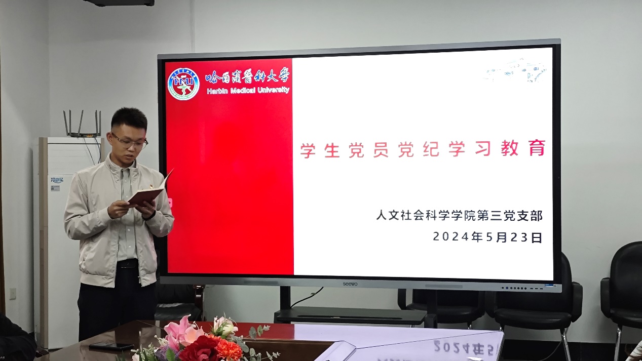 为深入学习贯彻习近平总书记关于党纪学习教育的重要讲话和重要指示精神,加强学生党员的党性教育和纪律意识,5月23日下午,人文社会科学学院第三党支部全体党员共同参与学生党员党纪学习教育。