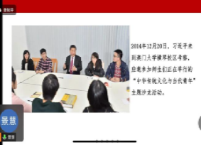 在5月29日线上学习交流活动中,王景慧与预备党员及发展对象共同探讨学习。她围绕三个核心要点,向同学们深入阐述了2014年12月20日习近平主席在澳门大学横琴校区考察期间,关于弘扬中华优秀传统文化、坚定文化自信的重要论述。具体而言:一是坚定文化自信:继承中华文化的DNA;二是学习传统文化:赋予时代内涵和精神;三是要强化爱国精神:从优秀文化汲取营养。