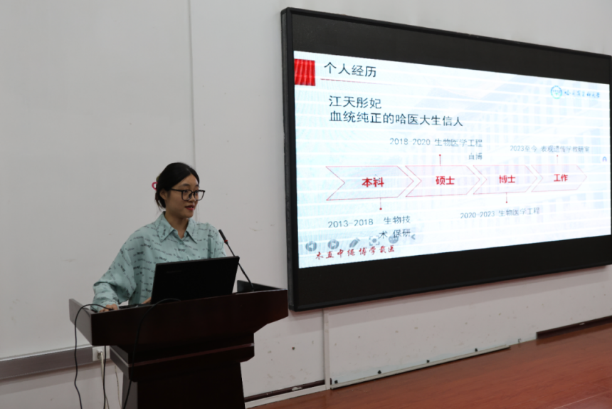 江天彤妃作为青年教师代表,同时作为学院优秀毕业生代表,以自身学习生活经验为引,用风趣幽默的方式鼓励新生找到适合自己的学习方式,并“拉紧学习的弦”,不断提升自身专业能力水平。同时学会管理时间,以把握学习与生活的平衡点,不断追求卓越。在校生代表张天结合自身学习经历,强调学习和实践的重要性,将学习付诸实践,又在实践中学习,发展多项技能。张翼斐作为智能医学工程专业新生,以充满激情的言辞表达了自己作为新一代哈医大生信人将砥砺前行,为学院的发展贡献智慧和力量。