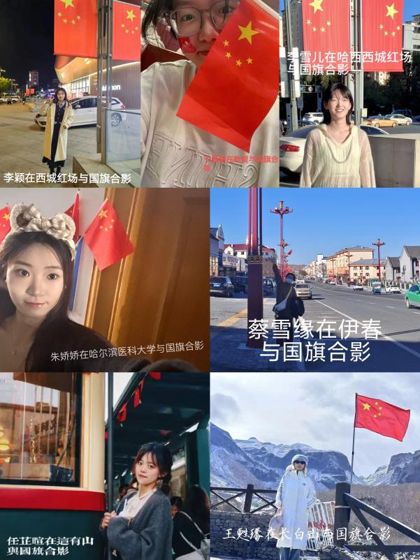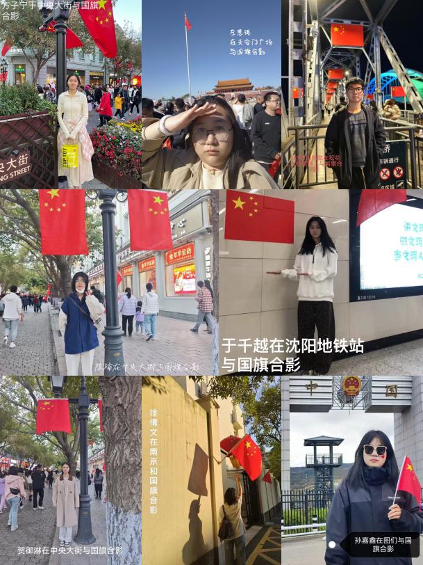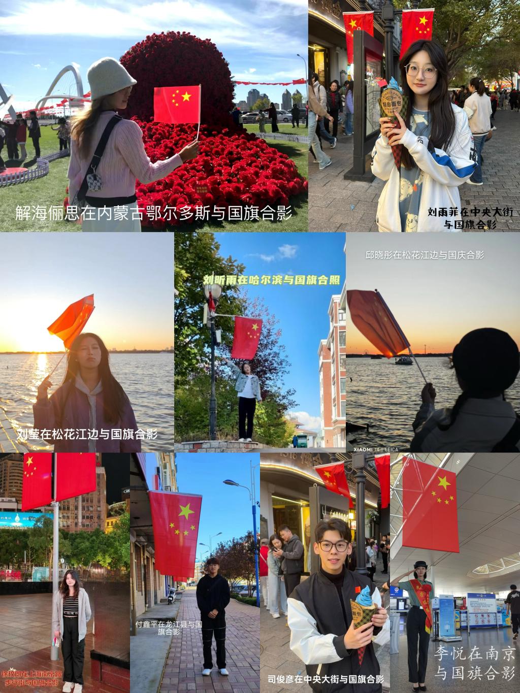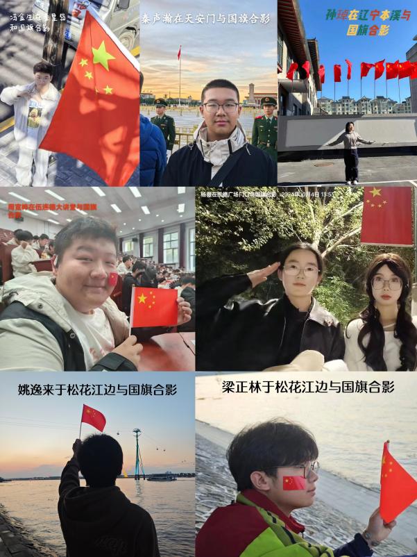 镜头下,一张张洋溢着青春活力的脸庞,与高高飘扬的五星红旗交相辉映,构成一幅幅动人心弦的画面。在晨光初照的天安门广场,在一碧万顷的松花江畔,在钟灵毓秀的长白山...生信学子手持国旗,面带微笑,用镜头定格下这难忘的瞬间。他们有的高举国旗,眼神中透露出对祖国的无限敬仰;有的轻轻抚摸着国旗的每一个褶皱,仿佛在感受国家发展的脉搏;还有的则与国旗深情对视,仿佛在进行一场跨越时空的对话,传递着对未来的无限憧憬和对祖国的深情厚谊。