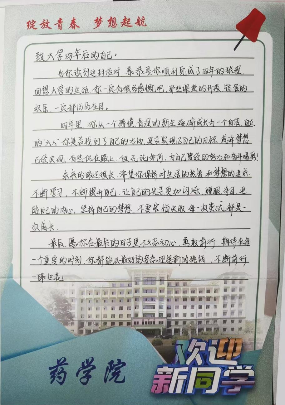 时光慢递,梦想可期,笺素摇曳,墨香四溢。近日,迎新工作已落下帷幕,可2024级药学人的故事才刚刚拉开序幕。在这个有特殊纪念意义的新起点,为使大一新生更好地融入药学大家庭,明确目标和梦想,更好地了解、激励自我,并增强时间感和规划意识,药学院特开展此次“时光慢递——致未来自己的一封信”心理成长活动。