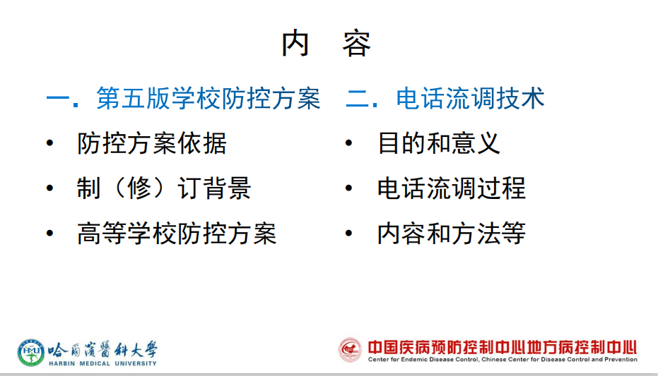 尹梅教授为我们提供心灵滋养,裴俊瑞教授则为我们的身体健康保驾护航。裴俊瑞教授的讲座从《第五版学校防控方案》的讲解及电话流调技术两个方面展开。讲座中,裴俊瑞教授通过认真对比高等学校新冠肺炎疫情防控技术方案第三、第四、第五版,从新版技术方案六个调整、高等学校开学前准备、返校途中防护、高等学校开学后师生管理要求、疫情监测与应急处置等方面为流调员进行系统介绍和深入解读,从七个方面为流调员进行新冠肺炎电话流调技术培训。讲座不仅详细讲解了理论和实际操练,更是对同学们的科研思维、科研方法、科研能力提高的一次培训。为进一步提升了广大师生对传染病的科学防范意识和正确应对能力,为坚决筑牢校园疫情防控底线奠定了基础。