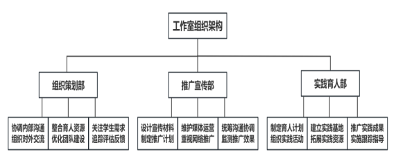 健全完善组织机构,设立组织策划部、推广宣传部和实践育人部,保障工作持续长效发展。组织策划部门负责工作室常规项目和活动的组织策划、沟通协调和团队管理等工作;推广宣传部负责宣传和推广辅导员工作室的各项活动和服务,运营网络平台和公众号推广;实践育人部负责组织和协调大学生的社会实践活动,促进学生与社会的接触和互动,夯实环境育人实效。
