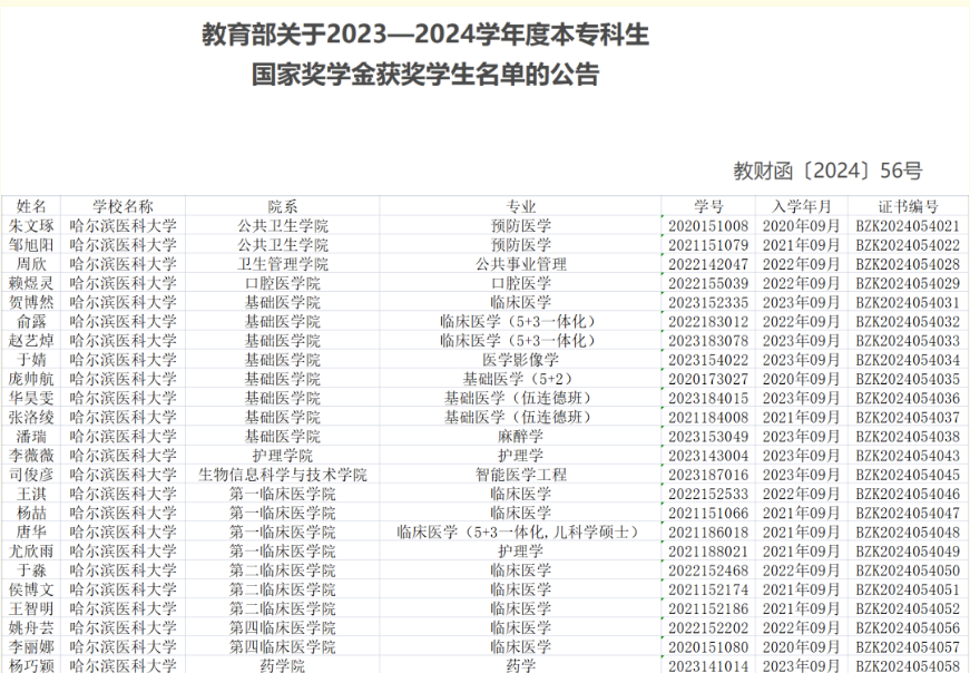 近日,教育部公布2023—2024学年度本专科生国家奖学金获奖学生名单,我校24名学生获此殊荣。国家奖学金是由中央政府出资设立的用来奖励特别优秀学生的奖学金,也是当前高等学校学生能够获得的荣誉等级最高的国家级奖学金。