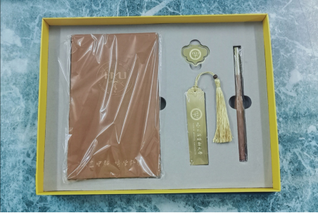 精品套装以其复古的配色而得名,其中包含印有HMU标志的笔记本,金铜色书签、钢笔以及小徽章,配色复古,高端有格调,是医大学子送人必备之礼品,既包含实用价值,又不失精美。