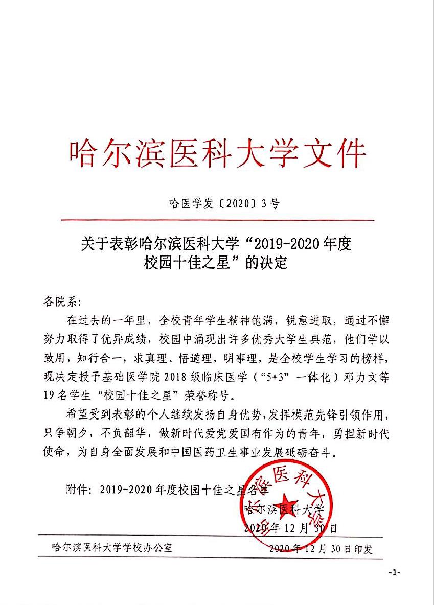 关于表彰哈尔滨医科大学“2019-2020年度校园十佳之星”的决定