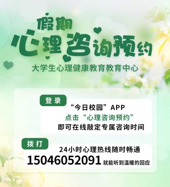 假期里,心理咨询服务不打烊。或许你会因规划被打乱而感到焦虑,或许会在独处时陷入莫名的低落,又或许对未来的方向感到迷茫——无论哪种情绪,都值得被认真对待。我们的心理咨询老师经验丰富,始终带着尊重与耐心,倾听你的每一份心声。在这里,你可以卸下所有防备,让积压的情绪得到疏导,让纠结的困惑找到出口。